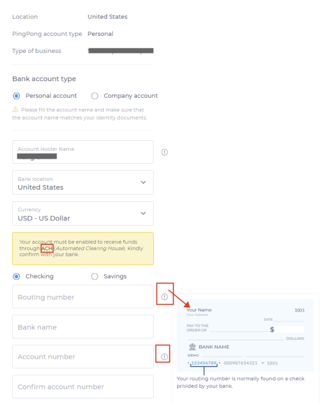 Step 5: Fill in the corresponding bank account information, this process must be followed for a personal account or an enterprise account. The bank card information you provide should be consistent with PingPong's registration information.