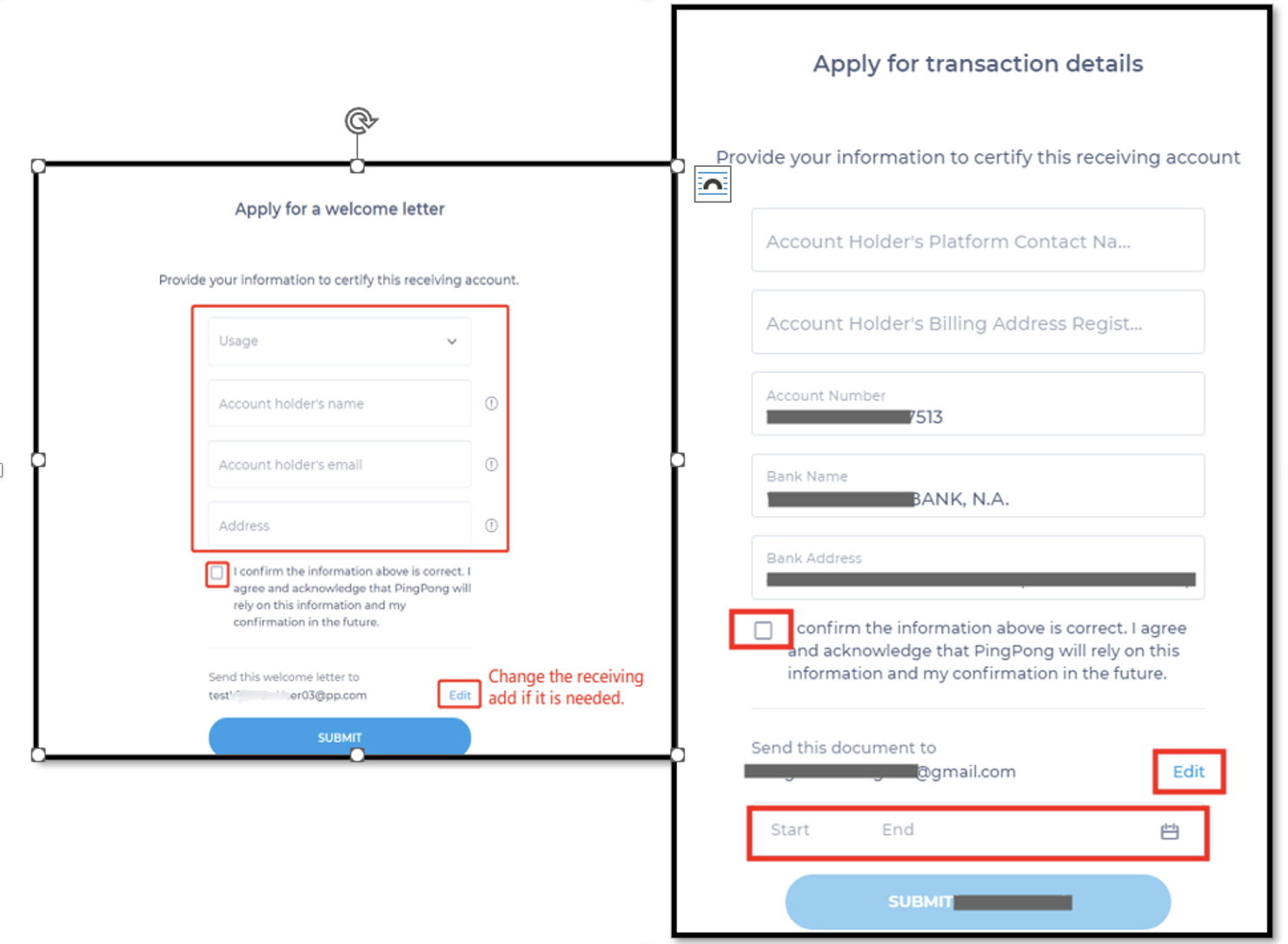 Step 2: Once you have your receiving account ready, you can find "Apply for a welcome letter OR transaction details option under your receiving account. Provide required information and submit.